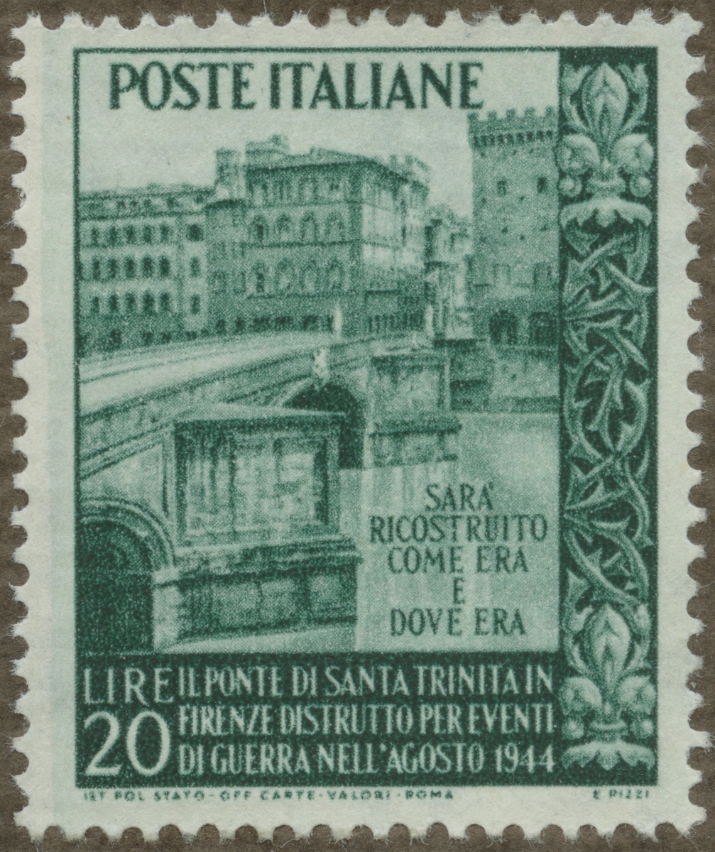 Frimärke från Italien, 1944. Motiv av Santa Trinitate bron i Florens