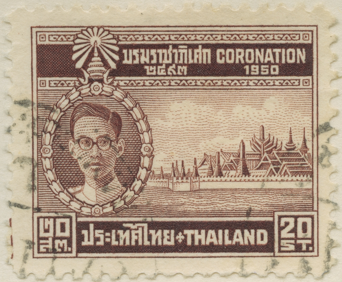 Frimärke från Siam (Thailand), 1950, Motiv av Kungaslottet i Siam (t.v.): Kung Phumiphon Aduldet -Minne av kröningen av Kung Phumiphon Aduldet som Rama IX: 5 maj 1950-