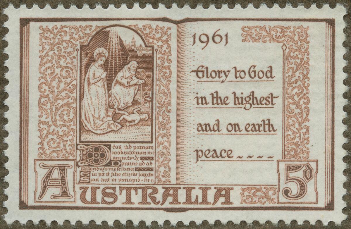 Frimärke från Australien, 1961. Motiv av Inkunabel på latin: "Glory to God in the highest and on earth peace..." -Julfrimärke-