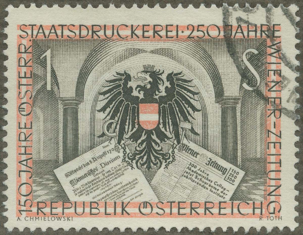 Frimärke från Österrike, 1954. Motiv av Tidningsuppslag. Österrikes vapen Statstryckeriet 150 år: 1804-1954. "Wiener Zeitung" 250 år: 1704-1954.