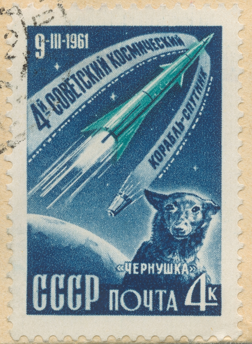 Frimärke från Ryssland, 1961. Motiv av Sputnik 9 och "Chernushka" hund. 4-de Sovjetiska rymdfarkosten i omloppsbana runt jorden 9 mars 1961. "Förstadagsbrev" med TEKA 0221274.