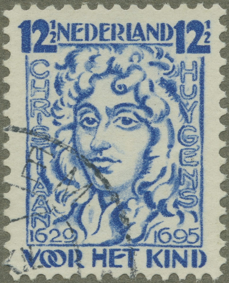 Frimärke från Nederländerna, 1928. Motiv av Christian Huygens 1629-1695. Fysiker i Nederländerna. Mekanik. Optik. Astronomi. Pendellagarna. Ljusets dubbelbrytning och polarisation. Vågrörelseteorien för ljuset. Grunden till sannolikhetskalkylen. Saturnus-systemet.