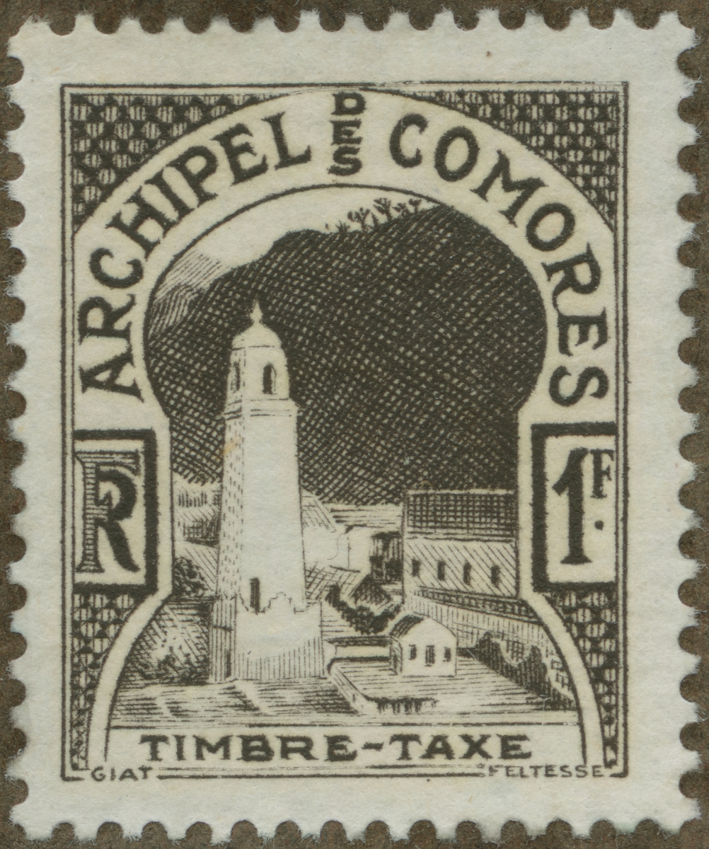 Frimärke från Comoresöarna, 1950. Motiv av minaret i Anjouan.