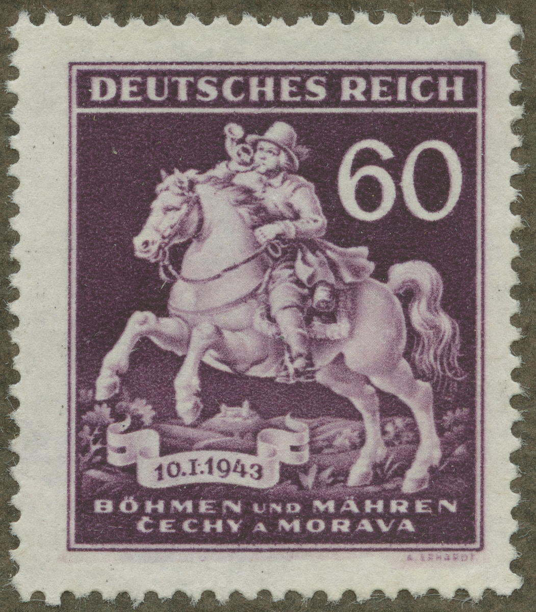 Frimärke från Böhmen och Mähren, 1943. Motiv av Postryttare från 1600-talet -Frimärkets Dag 10 januari 1943-