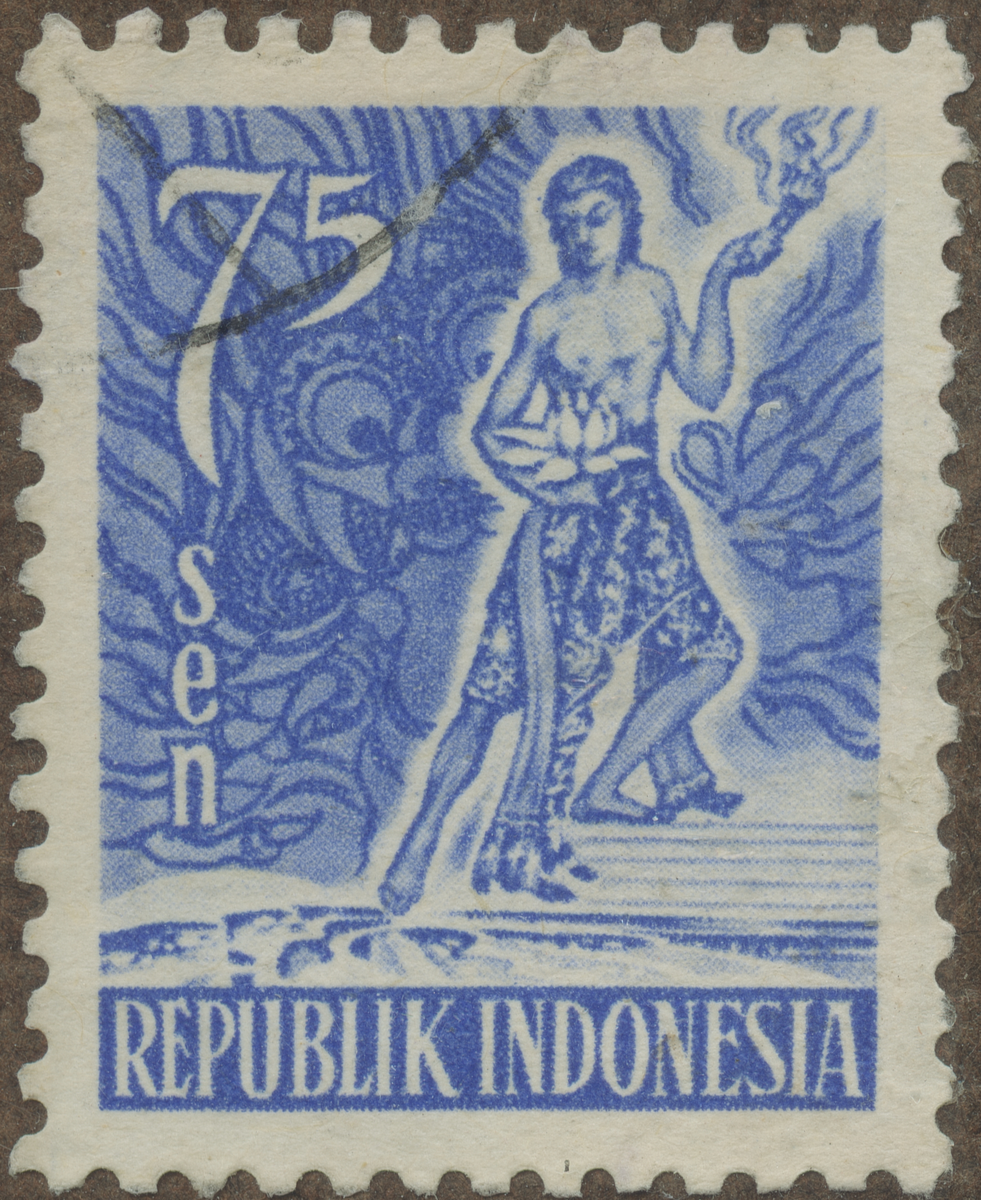Frimärke från Republiken Indonesien, 1953. Motiv av Mytologisk figur med fackla och lotus blomma.