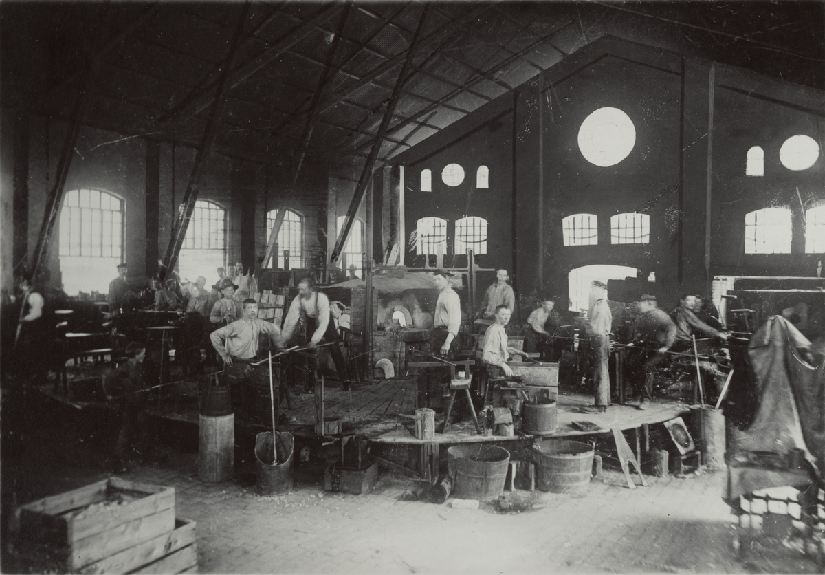 Glasbruk. Siebertsugn i fullt arbete. Ur album: Limmareds Glasbruk 1740-1902-1930.