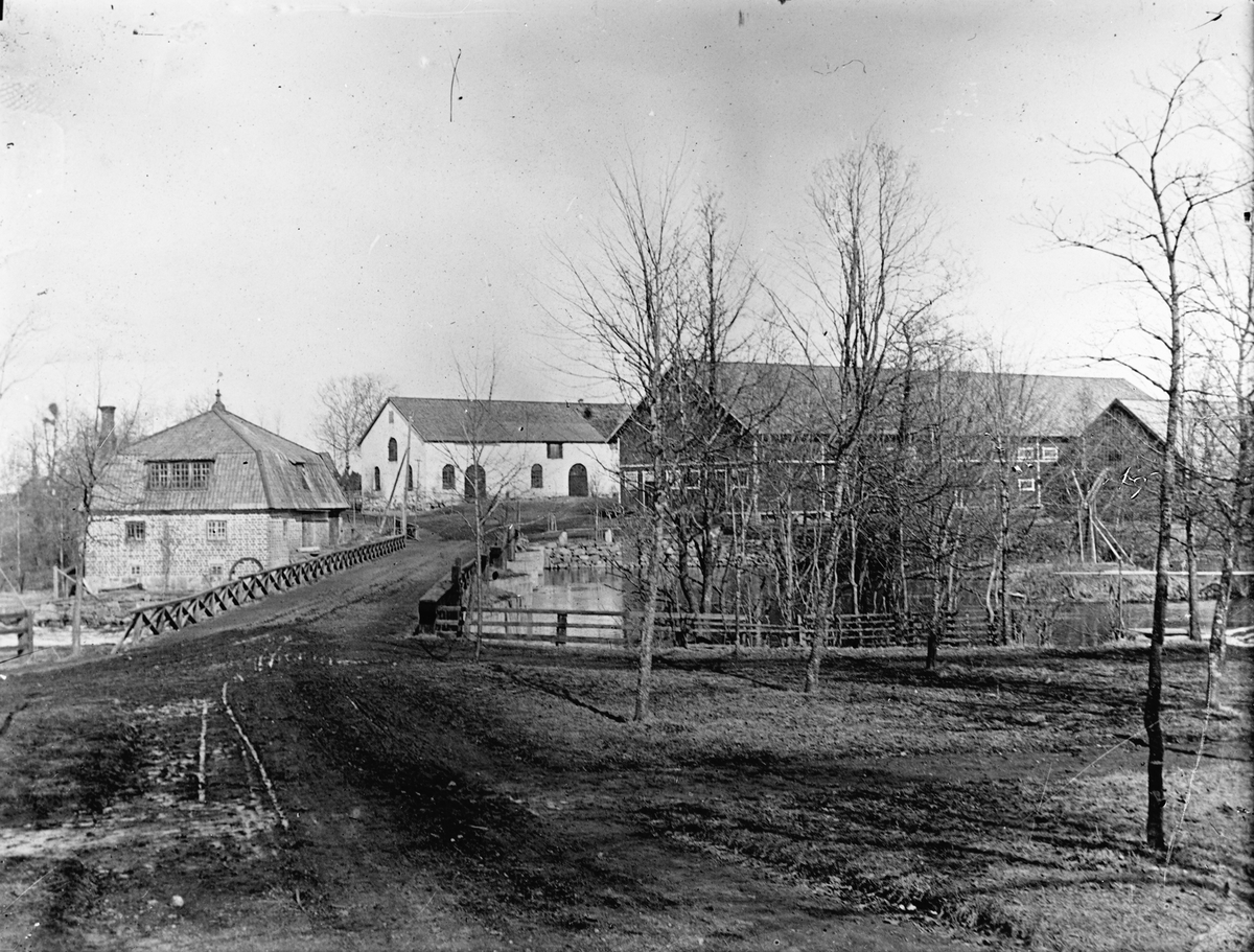 Wesslands bruk omkring år 1909. Smedjan låg till vänster om bron. Kvarnen i sitt ursprungliga skick, taket möjligen ombyggt på 1890-talet. Masugnen låg på bortre sidan om bron till >> höger, där på bilden en kaj byggts. Platsen igenfylld och delvis bebyggd med logen, som uppfördes omkring år 1904.Det vita huset i fonden är ett gammalt kolhus av slagg i lerbruk, sedan 1870-talet inrett till häststall, vartill det alltjämt användes. Byggnaden längst till höger är en fd rostugn.
