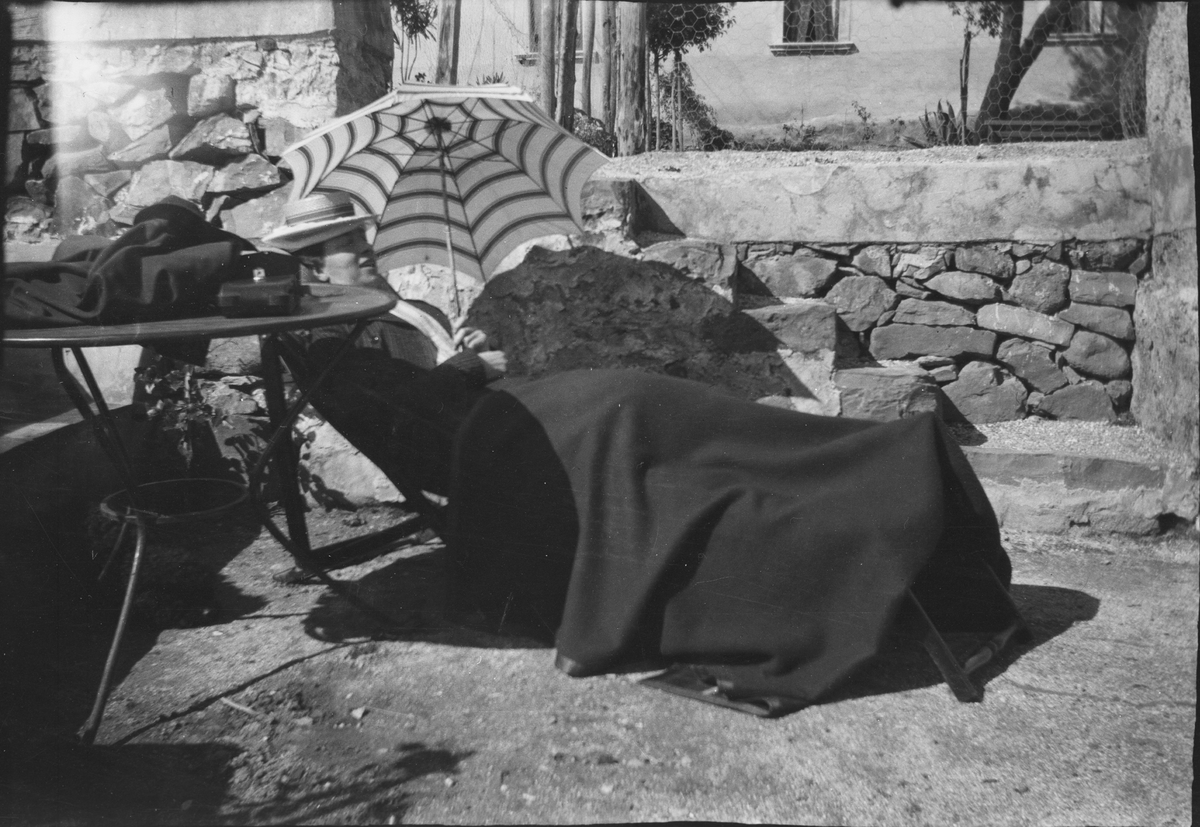 Drottning Victorias bilder. Drottning Victoria i solstol med paraply.