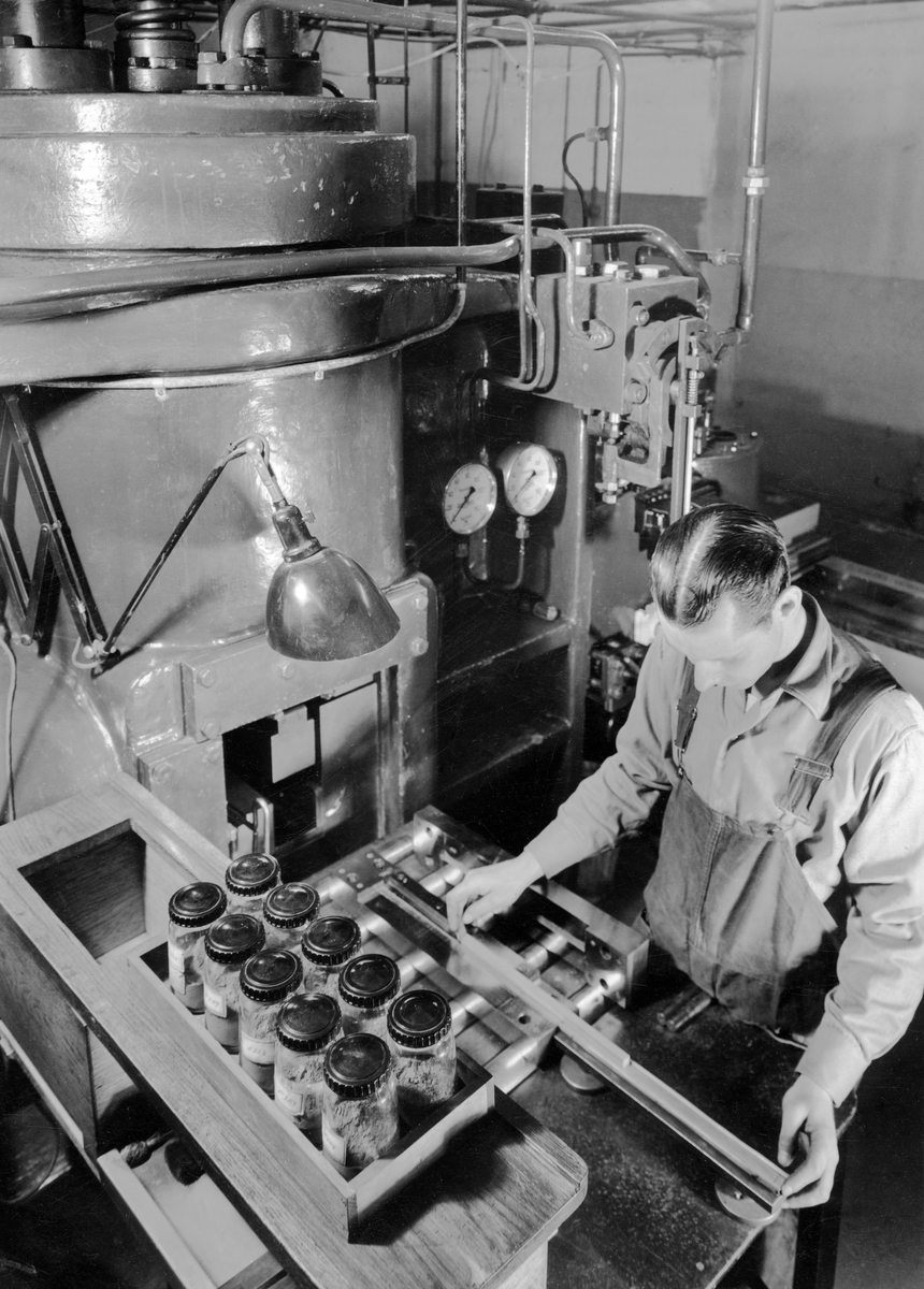 Elektriska maskiner. Den fyrkantiga staven på bilden består av volframpulver, som sammanpressats under högt tryck. Volframpulvret har utvunnits i Lumafabrikens volframsverk, ur svensk malm. Pulvret skall efter sintring, upphettning till 3 000 grader C och efter hamring, dragning och spiralisering användas till lystråd i glödlampor.