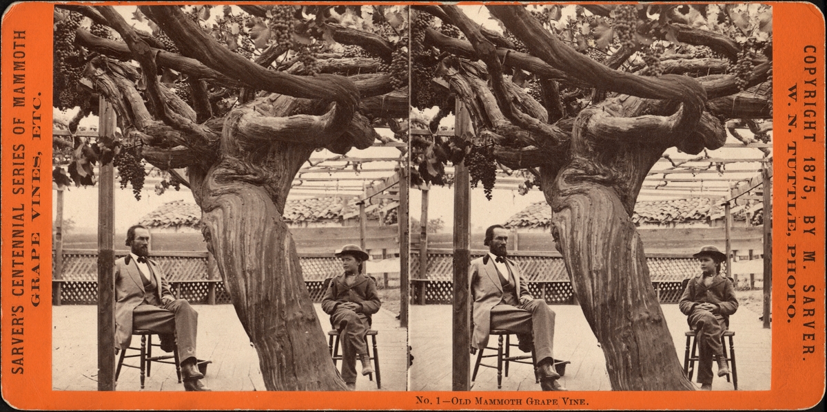Stereobild av man och pojke sittande under gammal vinranka.