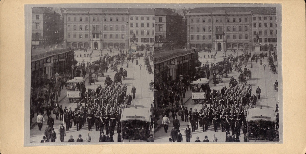 Stereobild av soldatmarsch bland folksamling och spårvagnar.