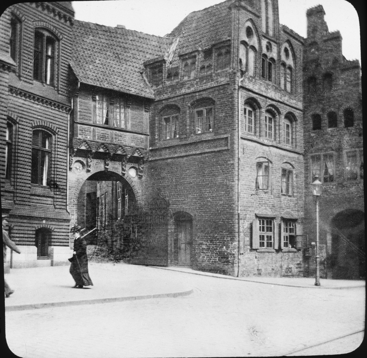 Skioptikonbild med motiv av kvinna vid Lübecker Burgtor (slottsporten) i Lübeck.
