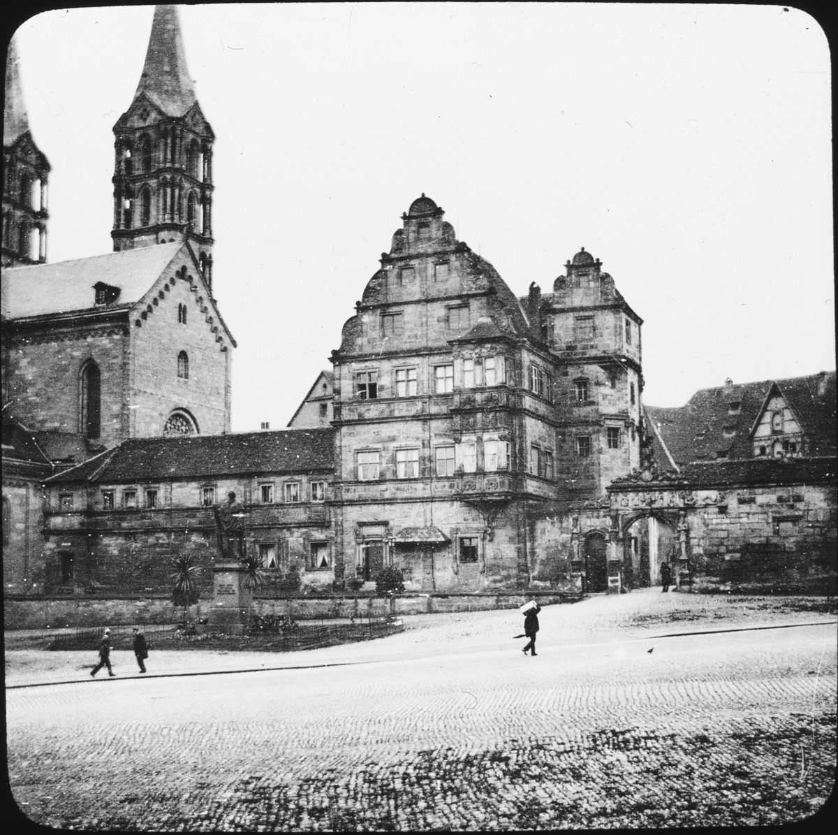Skioptikonbild med motiv av gamla domstolen Alte Hofhaltung i Bamberg.