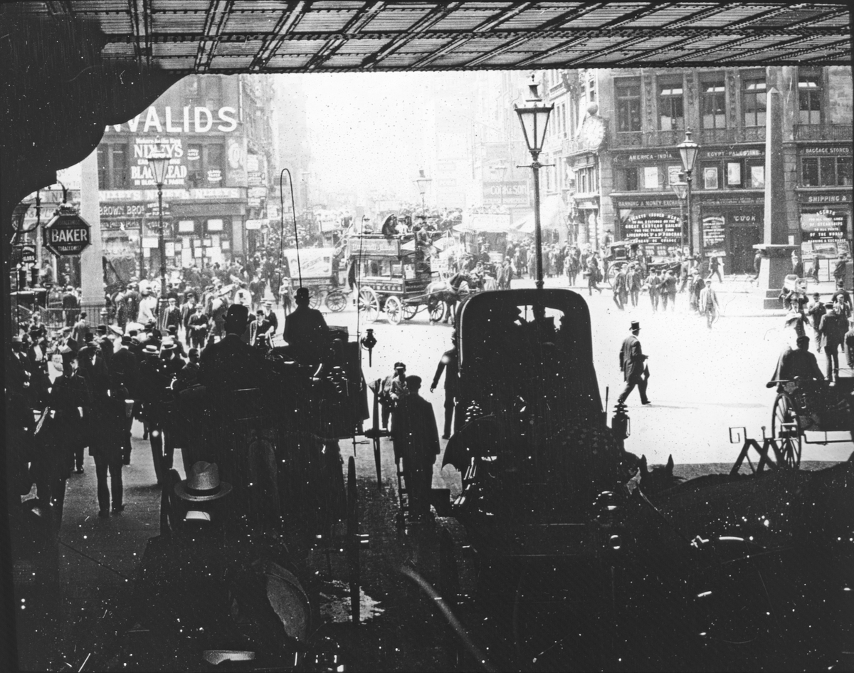 Skioptikonbild med motiv av trafikerad gata i London vid sekelskiftet 1900. Bakerstreet.
