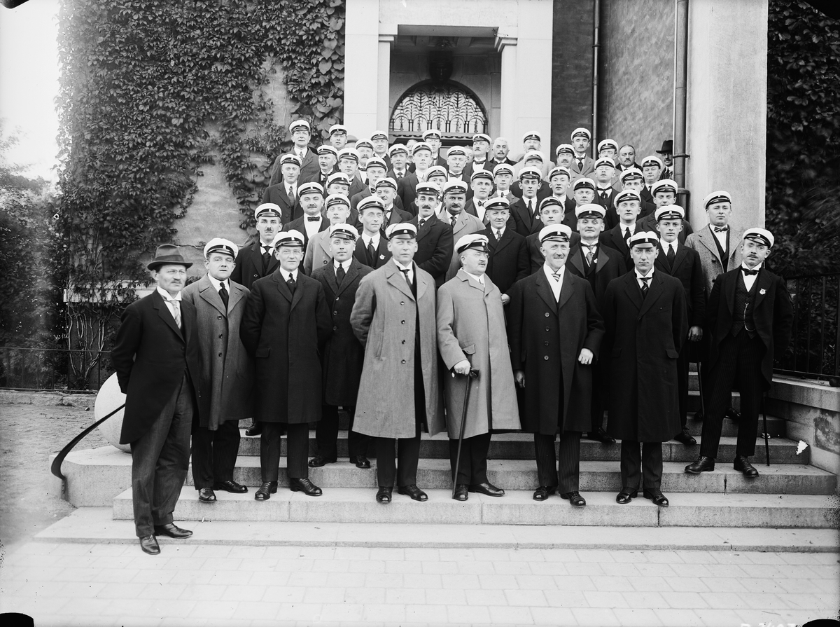 Gruppfotografi (män med examensmössa). Anordnare Stockholms stads verkstadsskolor.