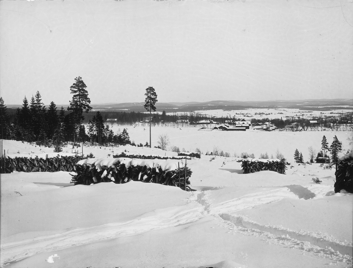 Diapositiv, fönsterbild av vinterlandskap, troligen i Hedemoratrakten.