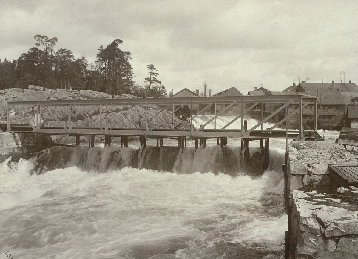 Trollhättan. "Jernbro emellan Gullön och Önan, samtidigt tjenande för uppvärmning af vattnet till Önan. Utförd hösten 1906 - våren 1907".