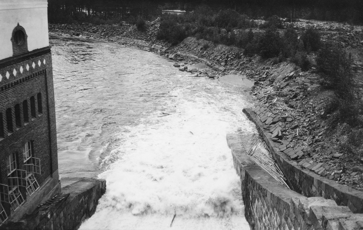 Forshults kraftverk. Från exkursionen den 9 juli 1929. Forshuset i Klarälven. Huspassninglinjen skulle flottningen gå i rännan t. h. men sker i det stora utskovet.