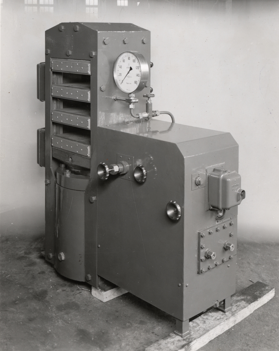 C.J. Wennbergs Mek. Verkstad, Karlstad, 1944. 60 tons hydraulisk press med elektriskt värmda plattor och motordriven pump.