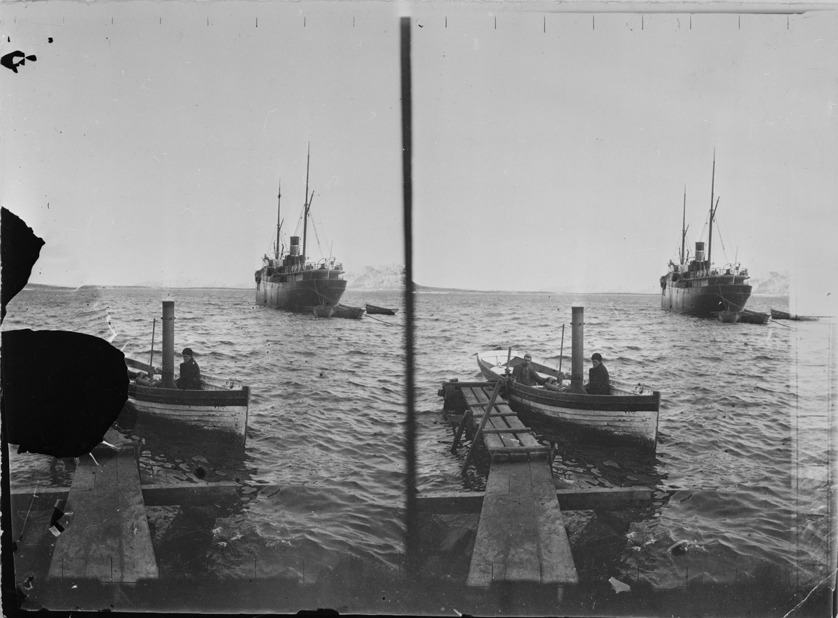 Stereobild, barkassen vid bryggan, med Virgo i bakgrunden.