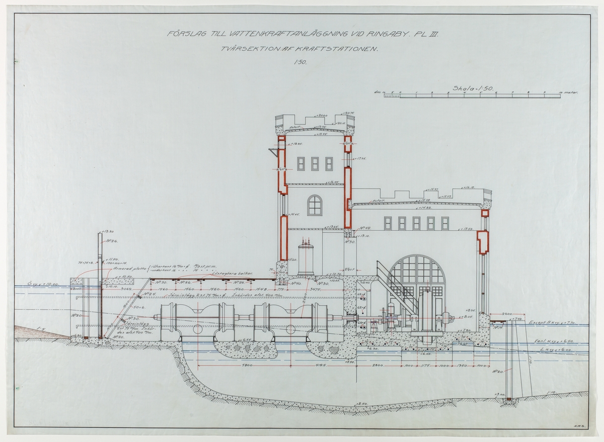 Ritning över förslag till vattenkraftanläggning vid Ringaby. Tvärsektion av kraftstationen.