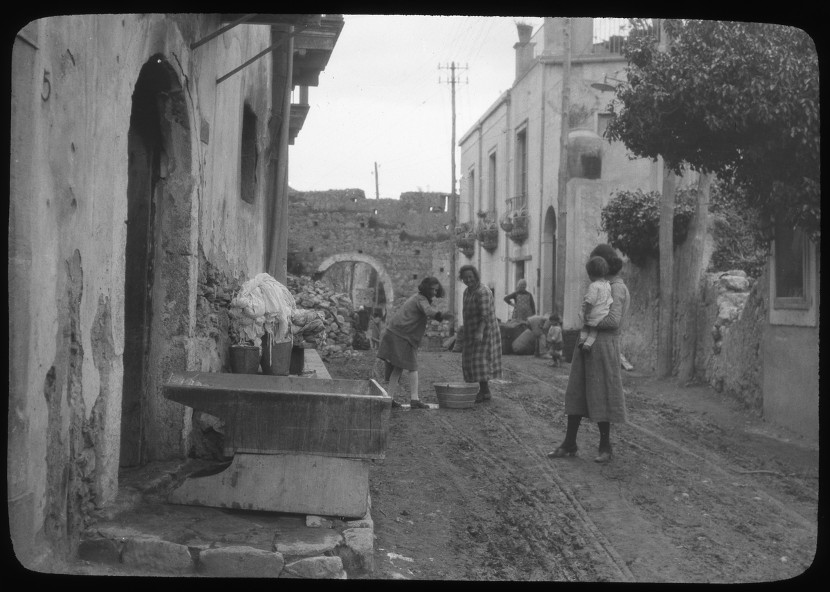 Skioptikonbild från institutionen för fotografi vid Kungliga Tekniska Högskolan. Bilden är troligen tagen av John Hertzberg under en resa i Europa. Hertzberg blev docent i fotografi 1921vid Kungliga Tekniska Högskolan i Stockholm. Kvinnor tvättar utomhus.