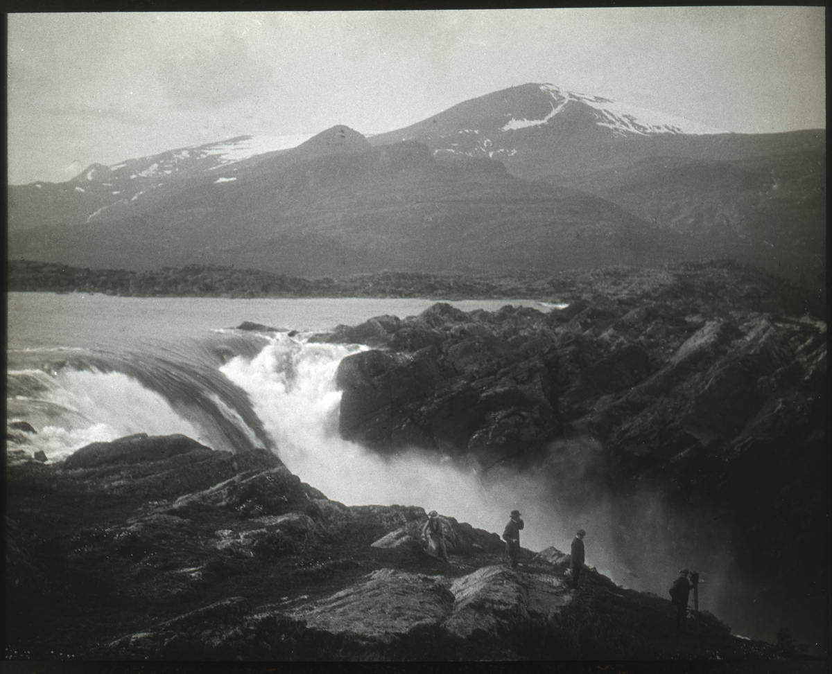 En kvinna och tre män i fjällvärlden vid Harsprånget. Mannen längst till höger i bilden med en kamera.