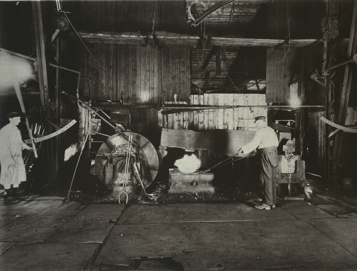 Boxholms Järnverk. Hopslagare i arbete med hopslagning av en lancashiresmälta vid mimblingshammaren i smältsmedjan omkring 1917.