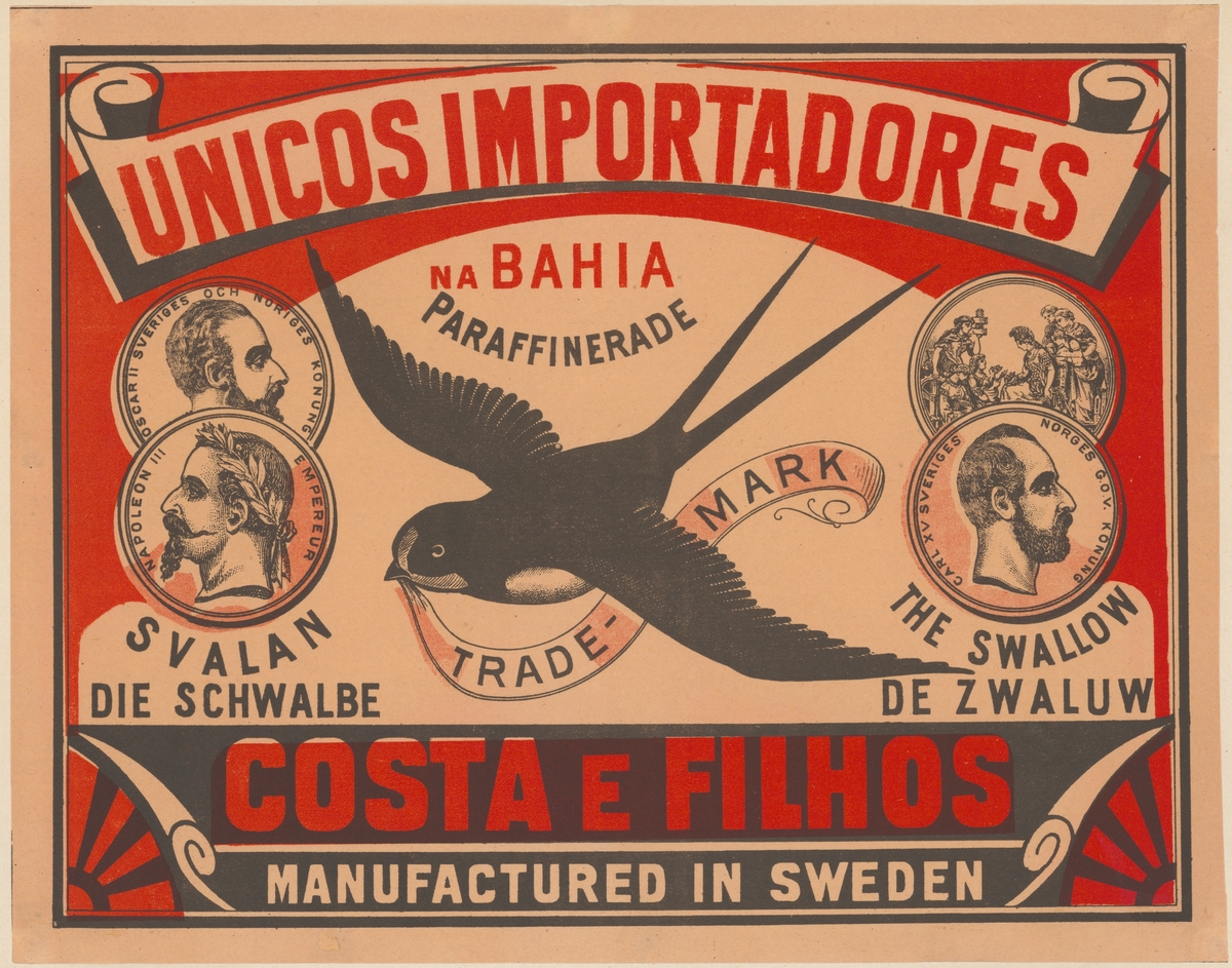 Titel: Etiketter för tändsticksaskar, från Svenskt Industri- och Handelsmuseum. Udevalla - Örebro. Svalans Tändsticksfabrik.