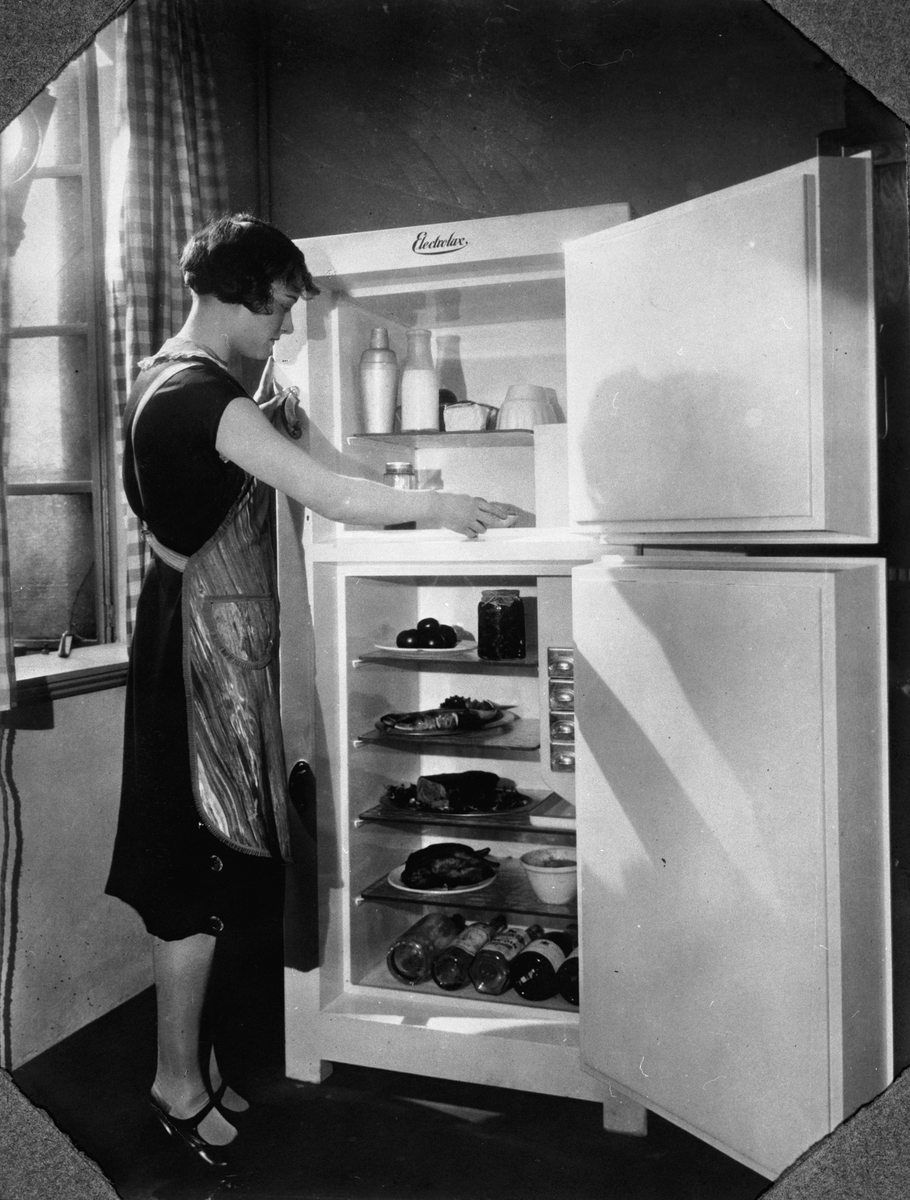 Elektrolux kylskåp, öppet. Kvinnlig demonstratör.