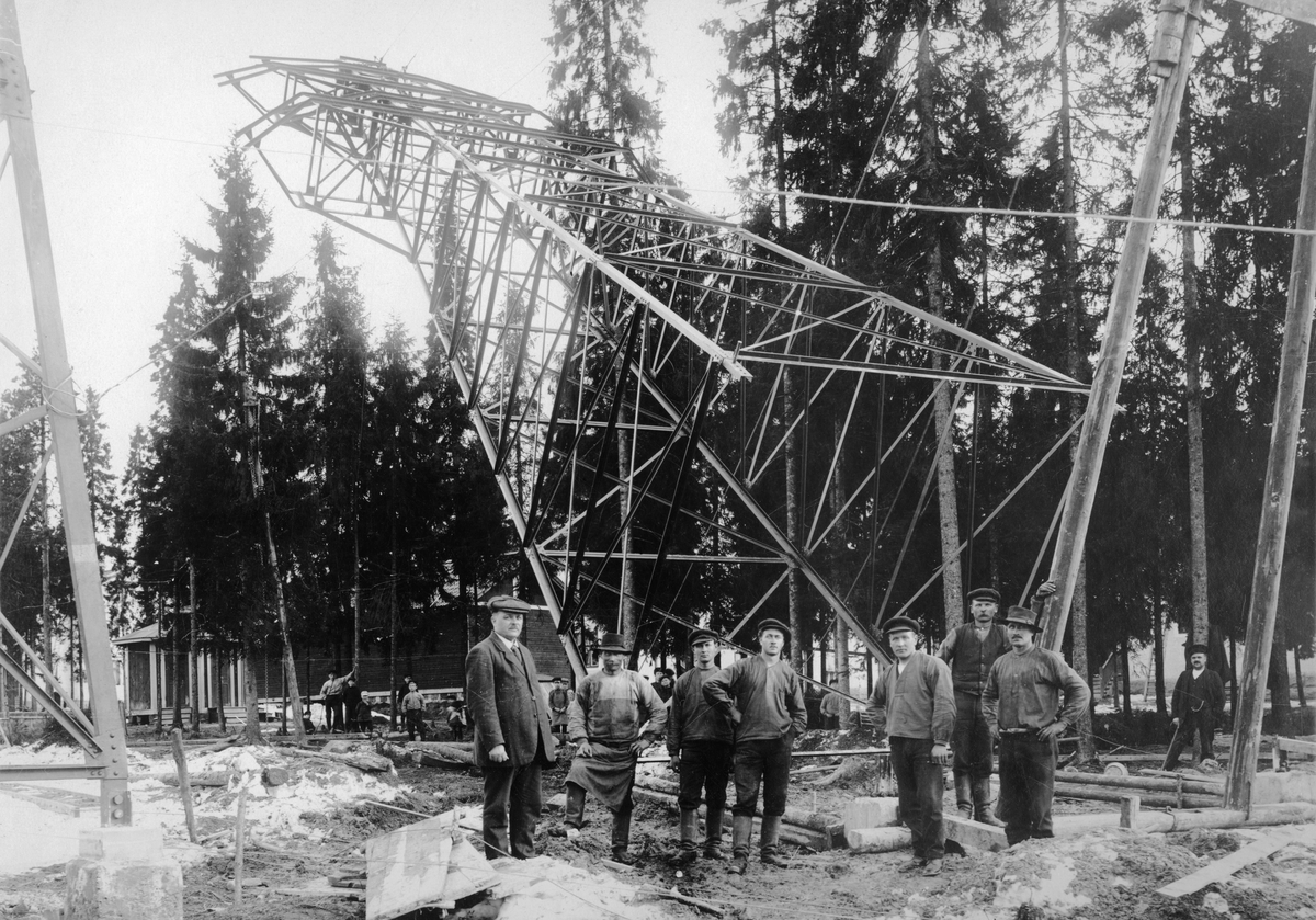 Västerdalälvens kraft AB:s anläggningar. Spännstolpe under resning.