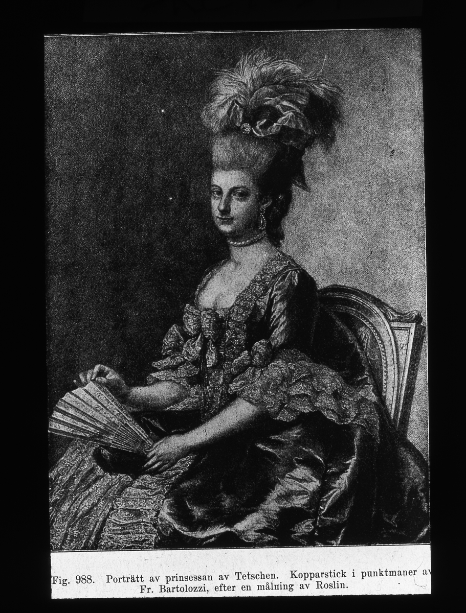 Porträtt av prinsessan av Tetschen. Kopparstick i punktmaner av Fr. Bartolozzi, efter en målning av Roslin.