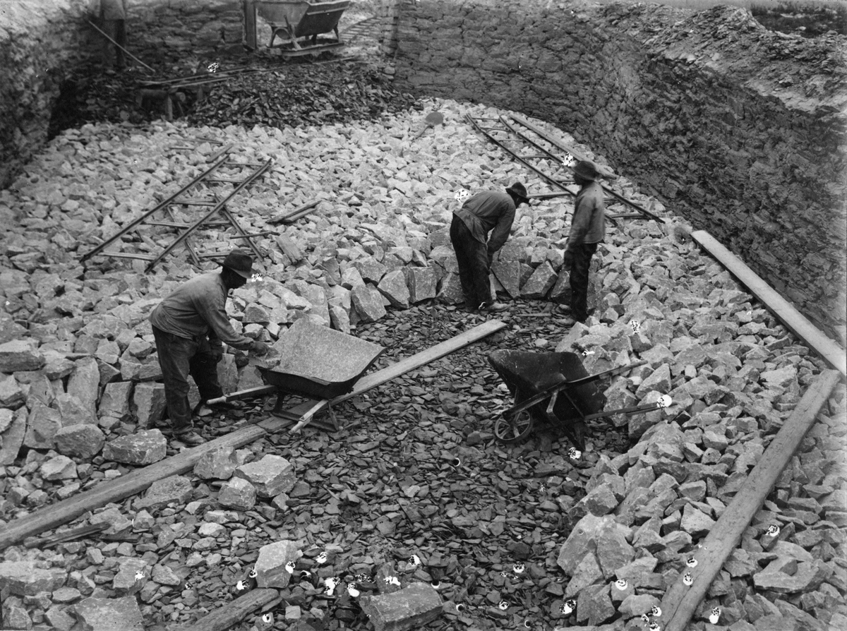 Bränning av kalk. Latorps bruk. Kalkn och skiffer lägges i varvis i ugnen för bränning.