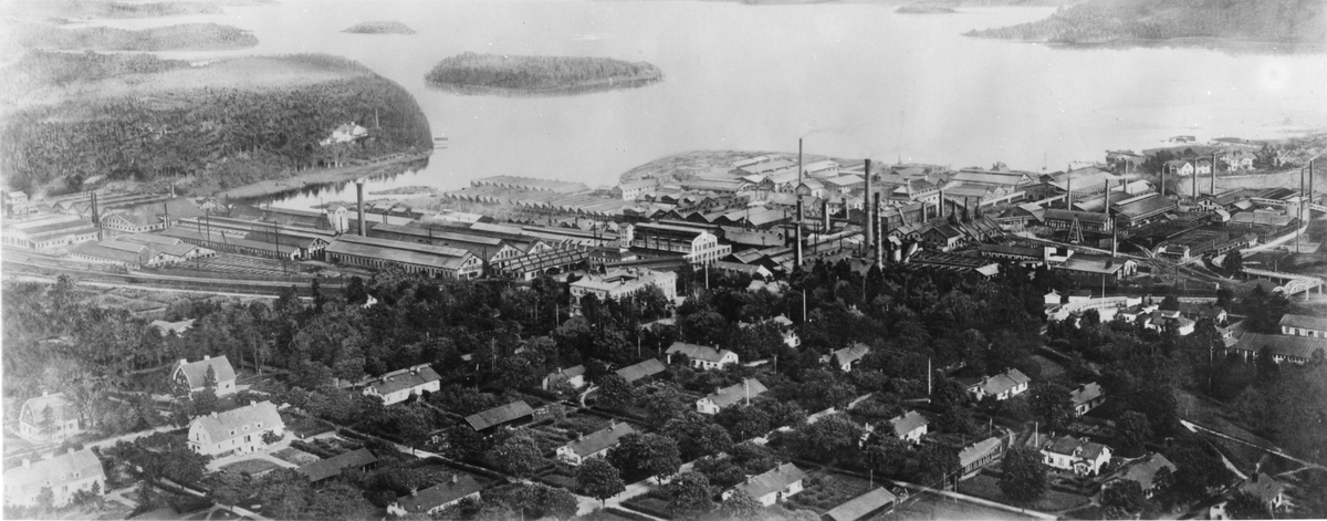 Flygfotografi över Sandvikens Järnverk (Sandvikens Jernverk). I förgrunden syns brukets tillhöriga arbetar- och tjänstemannabostäder. På andra sidan skymtar disponentbostaden.