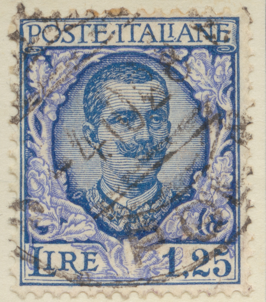 Frimärke från Italien, 1926. Motiv av ekkvistar med ollon och Kung Victor Emmanuel III.