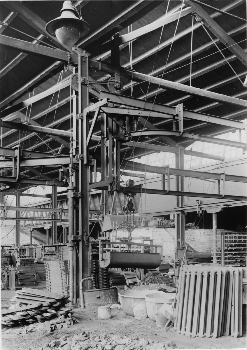 Norrahammars bruk. Luftbanor med hiss i gjuteriet framför kärnmakeriet, omkring 1915.