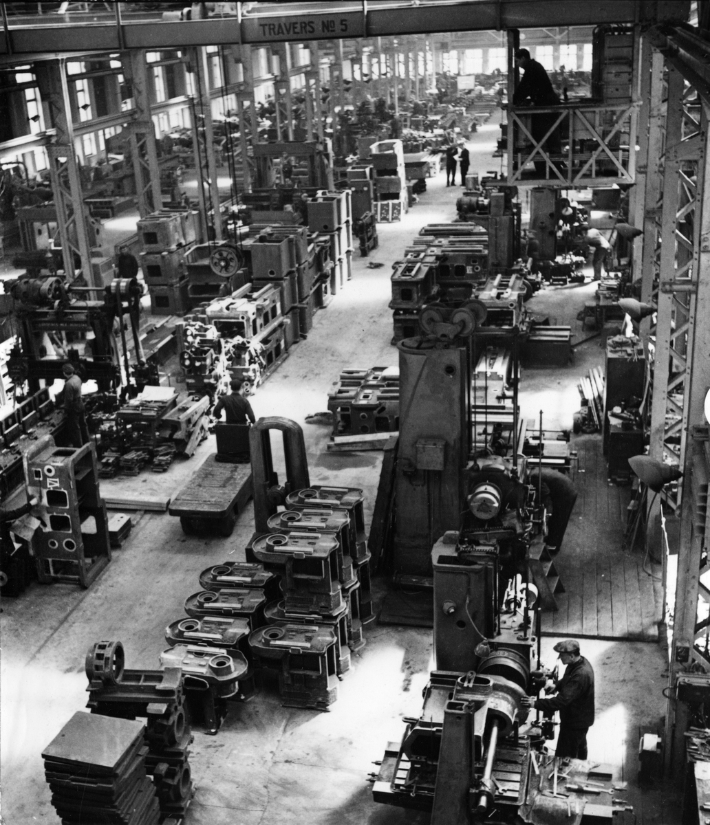 Lidköpings Mekaniska Verkst. AB. I denna hall verkställes bearbetningen av grövre detaljer, såsom stativ, slider etc. 1944