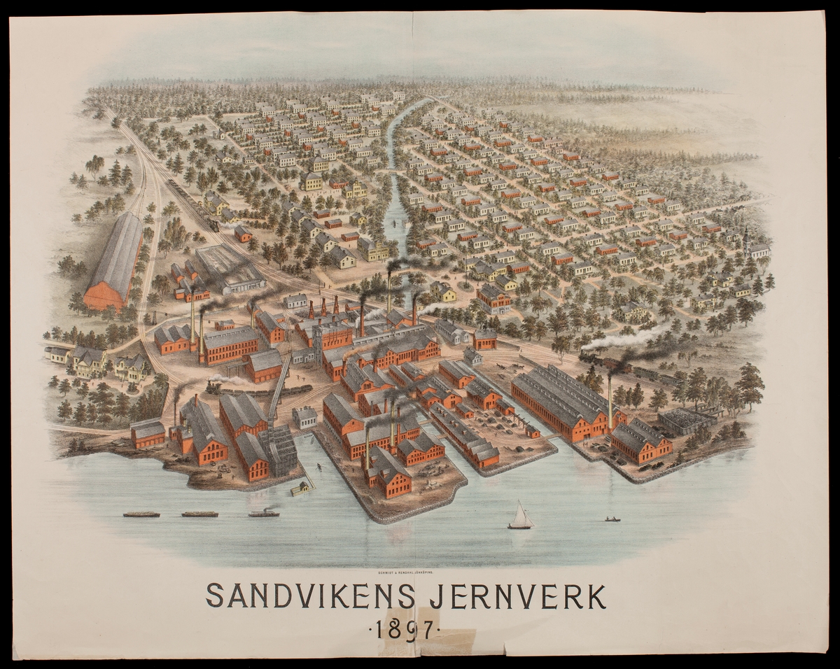 Plansch. Vy över Sandvikens Järnverk med omnejd (Sandvikens Jernverk) 1897.