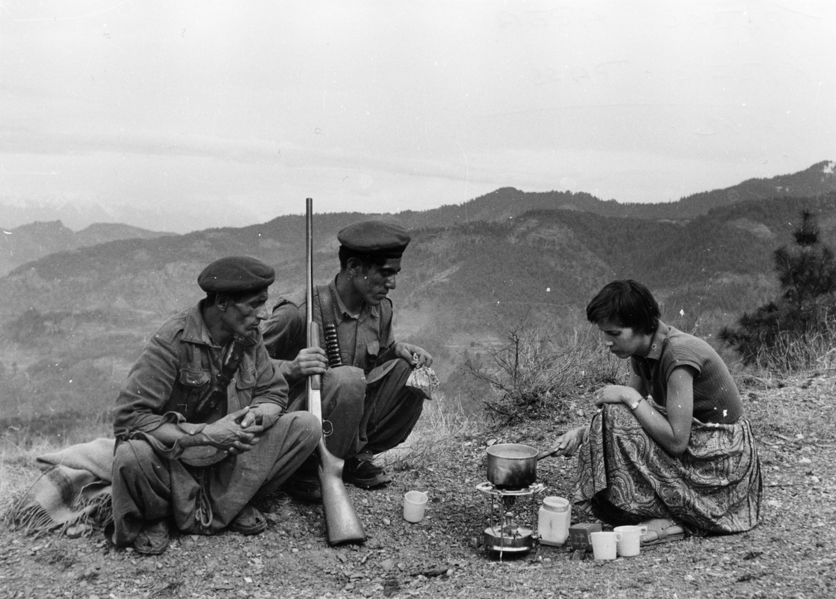 Soldater och kvinna med fotogenkök från Optimus i Khyberpassets klanområde mellan Afghanistan och Pakistan 1962.