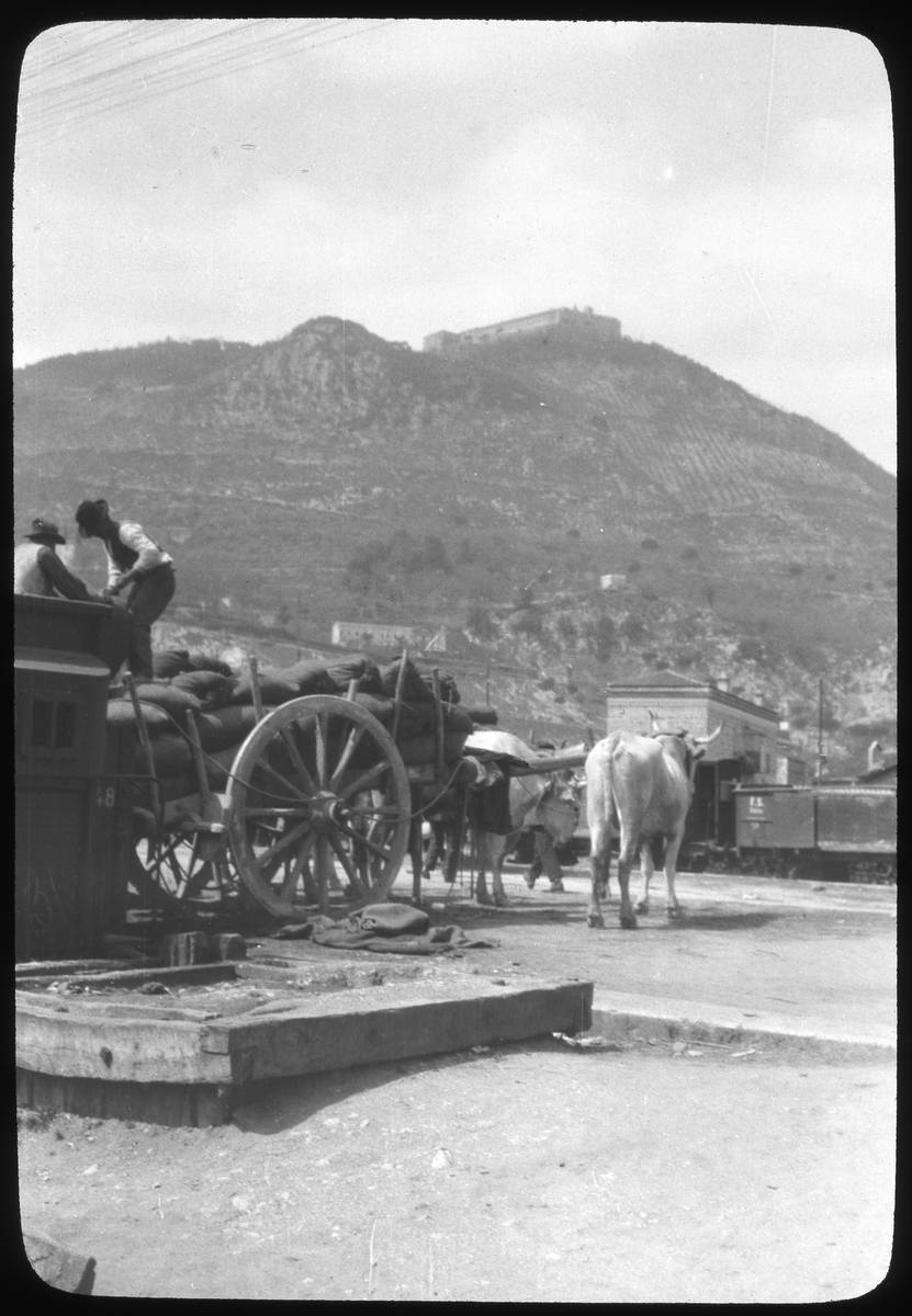 Skioptikonbild från institutionen för fotografi vid Kungliga Tekniska Högskolan. Bilden är troligen tagen av John Hertzberg under en resa i Europa. Hertzberg blev docent i fotografi 1921vid Kungliga Tekniska Högskolan i Stockholm. Män lastar på en vagn bakom dragdjur.
