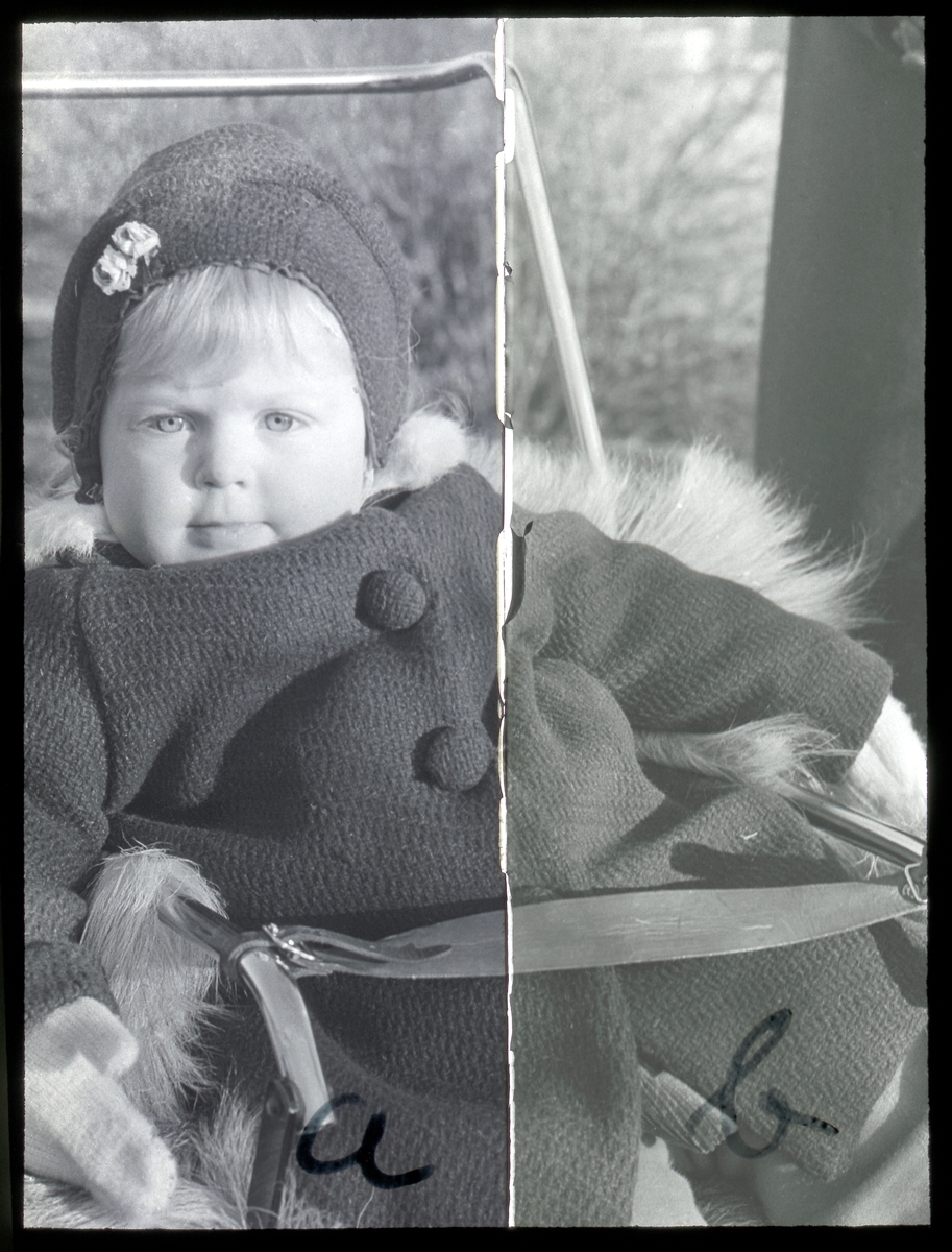 Skioptikonbild från institutionen för fotografi vid Kungliga Tekniska Högskolan. Använd av professor Helmer Bäckström som föreläsningsmaterial. Bäckström var Sveriges första professor i fotografi vid Kungliga Tekniska Högskolan 1948-58. Motiv föreställande Flicka i barnvagn.På bilden står skrivet: Betad ½ minut rodankoppar. ?-rodamin 1%. Slutligen a) Ofix b) Fix 10% tiosulfat 2 min. H. Bäckström jan 1936.