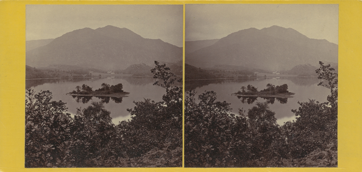 Stereobild med motiv av sjön Loch Achary med berget Ben Venue i bakgrunden, Skottland.