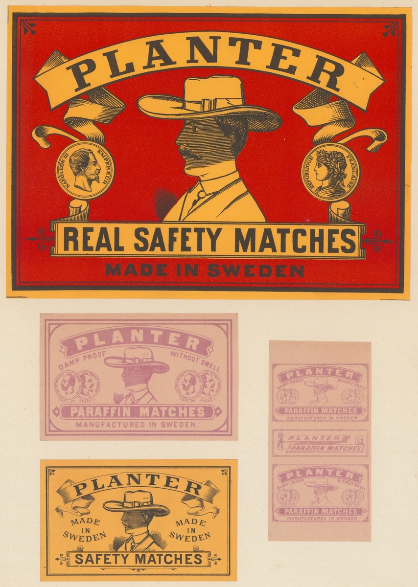 Etiketter för tändsticksaskar, från Svenskt Industri- och Handelsmuseum.