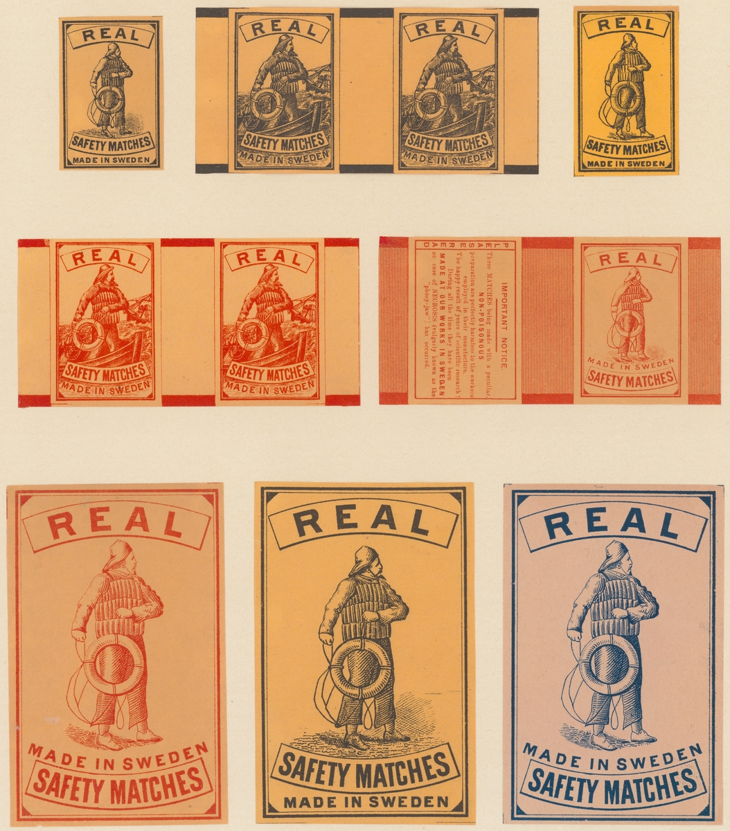 Etiketter för tändsticksaskar, från Svenskt Industri- och Handelsmuseum.