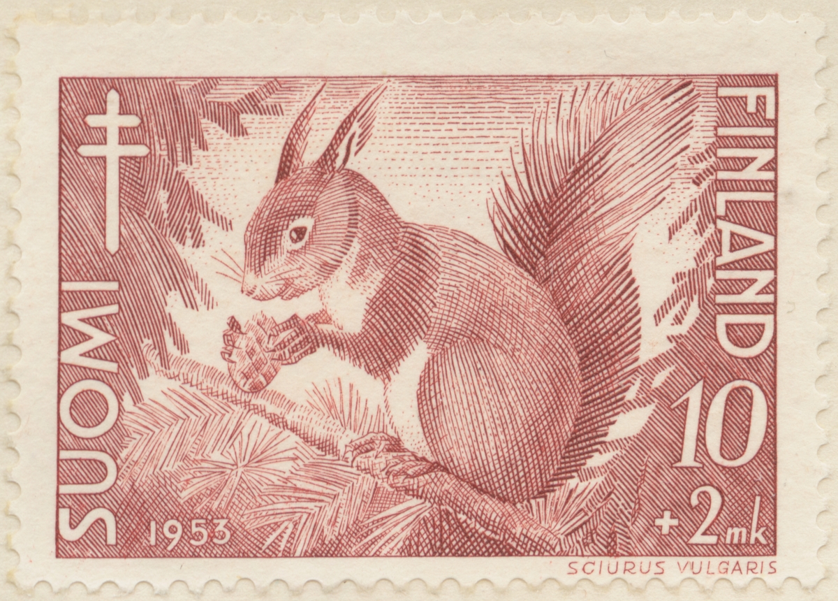 Frimärke från Finland, 1953. Motiv av Ekorre: Sciurus Vulgaris -Till förmån för förebyggandet av TBC-