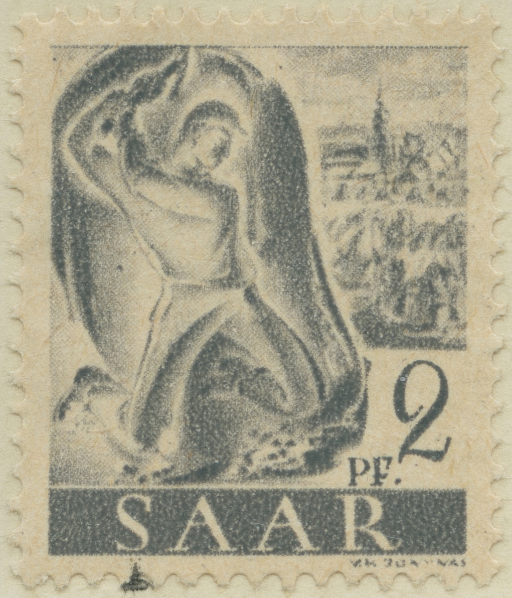 Frimärke ur Gösta Bodmans filatelistiska motivsamling, påbörjad 1950. Frimärke från Saar, 1947. Motiv av "(i bakgrunden): Saar landskap (t.v.)- Saar gruvarbetare"