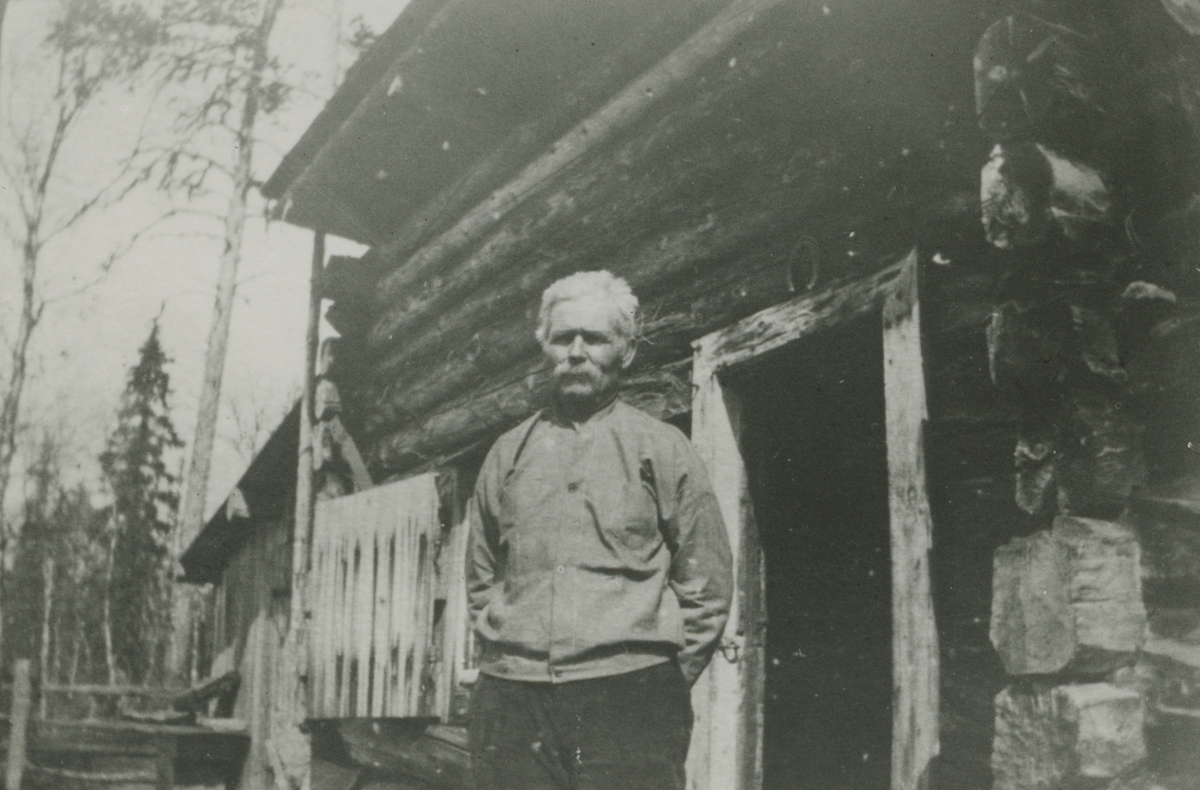 Fotografi från expedition till Peru 1920. Motiv av man med mustasch vid ingången till trästuga.