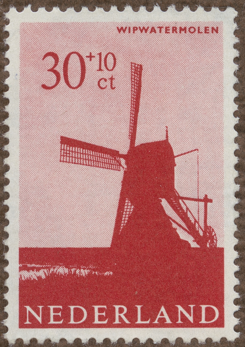 Frimärke ur Gösta Bodmans filatelistiska motivsamling, påbörjad 1950. Frimärke från Holland, 1963. Motiv av Vinddriven vippbart invallnings- skovelhjulverk. "-Kvarn-serie till förmån för socialt och kulturellt arbete-"