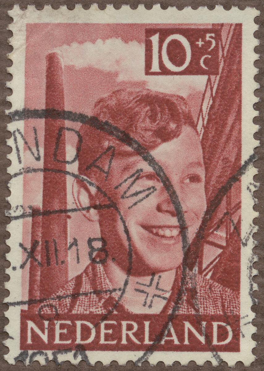 Frimärke från Nederländerna, 1951. Motiv av Fabriksskorsten i bakgrunden Pojke