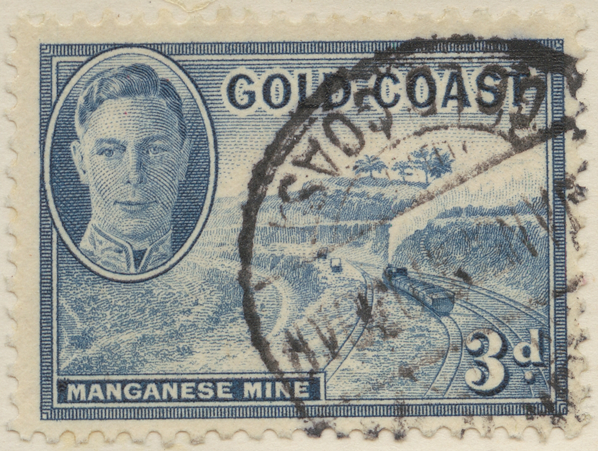 Frimärke från Guldkusten, 1948. Motiv av Mangan Gruvor (t.v.): Kung George VI-